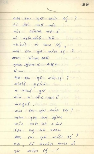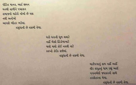 • گجراتی: “લીલાછમ ઘાસ પર તડકો ઢોળાય અહીં – તડકાને કેમે કરીનેઝાલ્યોઝલાયનહીં.આભમાાંમેઘધનુષમ્હોરતુ,ાંફોરતુ,ાંહવામાાં રાંગનાાંવતુળુોદોરતુ…ાંજીંદગીધન્દ્યછે,ધન્દ્યછે.”