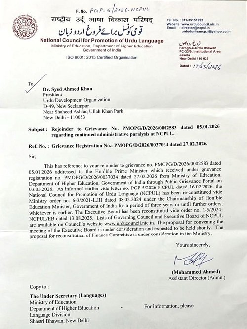 کیرانہ، 28 مارچ (عظمت اللّٰہ خان)۔ مظفرنگر میں اردو ڈیولپمنٹ آرگنائزیشن کی ایک اہم میٹنگ کے دوران قومی کونسل برائے فروغ اردو (این سی پی یو ایل) کی از سرِ نو تشکیل کے سلسلے میں مرکزی حکومت کی جانب سے موصول مثبت جواب پر خوشی کا اظہار کیا گیا۔ عہدیداران نے کہا کہ اس پیش رفت سے کونسل کی انتظامی سرگرمیوں کی بحالی کی امیدیں روشن ہو گئی ہیں۔